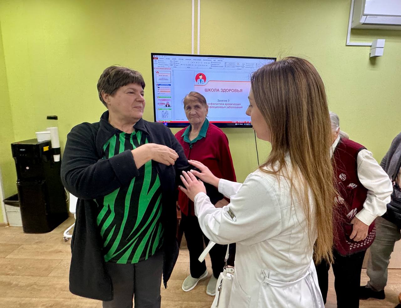 Участники узнали о сердечно-сосудистых заболеваниях, злокачественных новообразованиях, хронических респираторных болезнях и сахарном диабете. Врач уделила внимание управляемым факторам риска (гипертония, атеросклероз, курение, питание, активность), объяснила технику измерения давления и алгоритмы действий при кризе, сердечном приступе и инсульте.