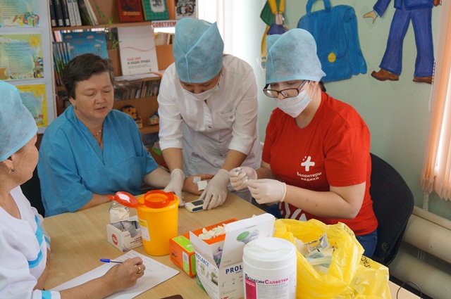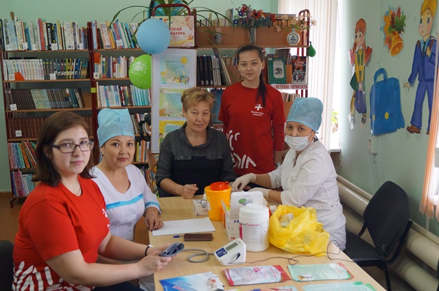 Затем молодые люди приступили к проведению профилактического обследования, которое позволило в короткие сроки оценить состояние здоровья участников акции: совместно с медицинскими работниками они измерили артериальное давление, определили индекс массы тела, уровень холестерина и глюкозы в крови. По результатам обследования жители поселка получили индивидуальные рекомендации по сохранению и укреплению здоровья и приняли участие в тренинге «Профилактика неинфекционных заболеваний и острых состояний».
