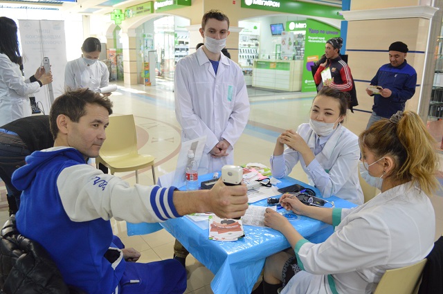 В рамках акции «Здоровые мужчины – сильное Отечество» для жителей и гостей Сургута было организовано комплексное профилактическое обследование, во время которого специалисты лечебно-профилактических учреждений и волонтеры определяли индекс массы тела, уровень глюкозы в крови и насыщенность артериальной крови кислородом, измеряли артериальное давление и количество углекислого газа в выдыхаемом воздухе.