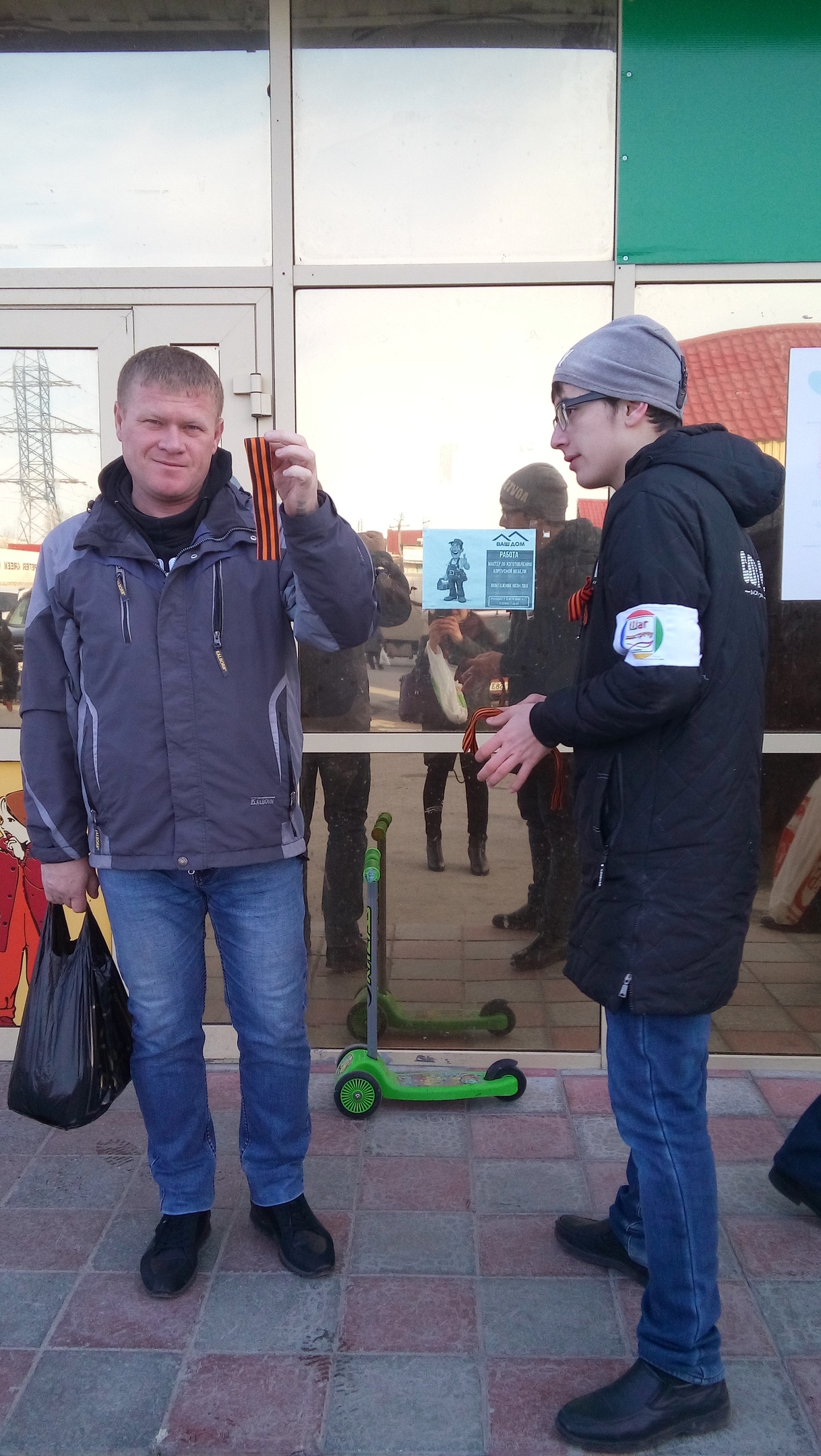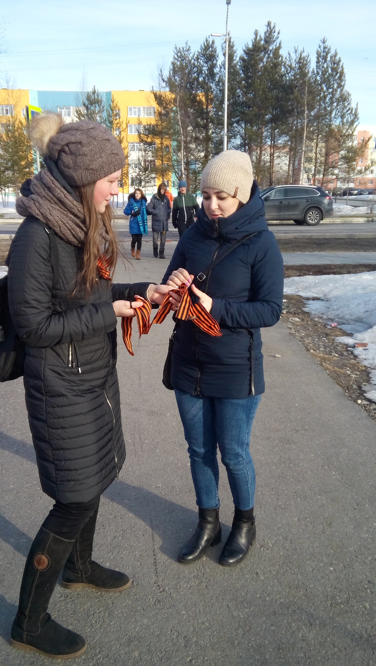 Ребята раздавали ленточки жителям города и рассказывали, что означают цвета ленты и что она значит в истории. Также волонтеры показывали, как правильно нужно ее крепить.