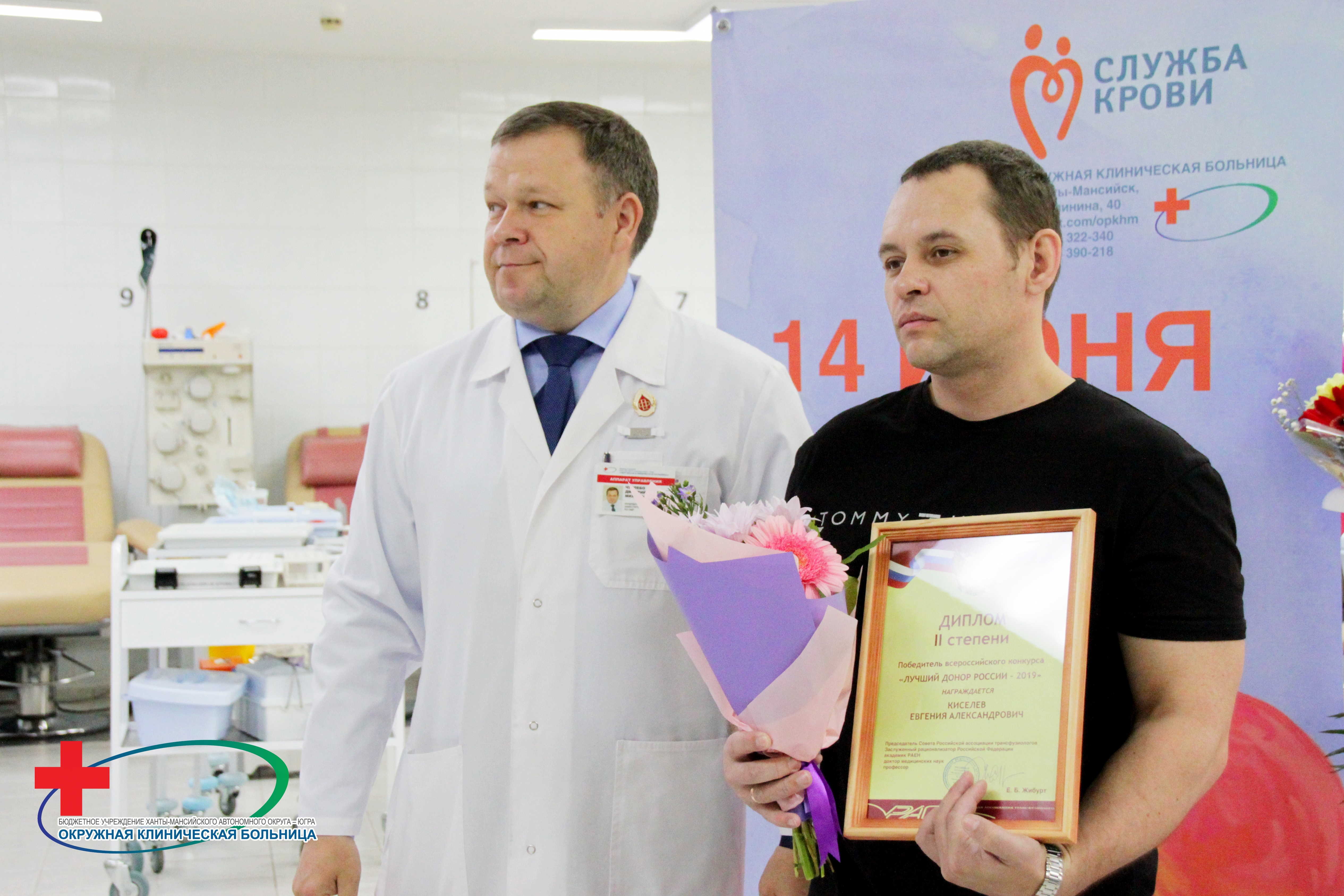 Евгению Киселеву вручили диплом победителя Всероссийского конкурса «Лучший донор России-2019» в номинации «максимальное количество донаций тромбоцитов».