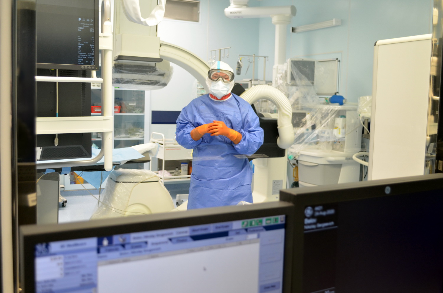 Хирургические вмешательства у пациентов с подтвержденным или предполагаемым COVID-19 проходят в условиях беспрецедентной защитымедицинского персонала. Для спасения пациентов применяют малотравматичные методики, то есть через небольшой прокол в артерии. В период пандемии с точки зрения врачей – это золотой стандарт. Между тем, сами операции в период пандемии мало чем отличаются от традиционных вмешательств – появились лишь дополнительные меры эпидбезопасности. Самое сложное - привыкнуть кзащитному костюму, под которым еще один, но уже просвинцованный, весом в 15 килограммов!