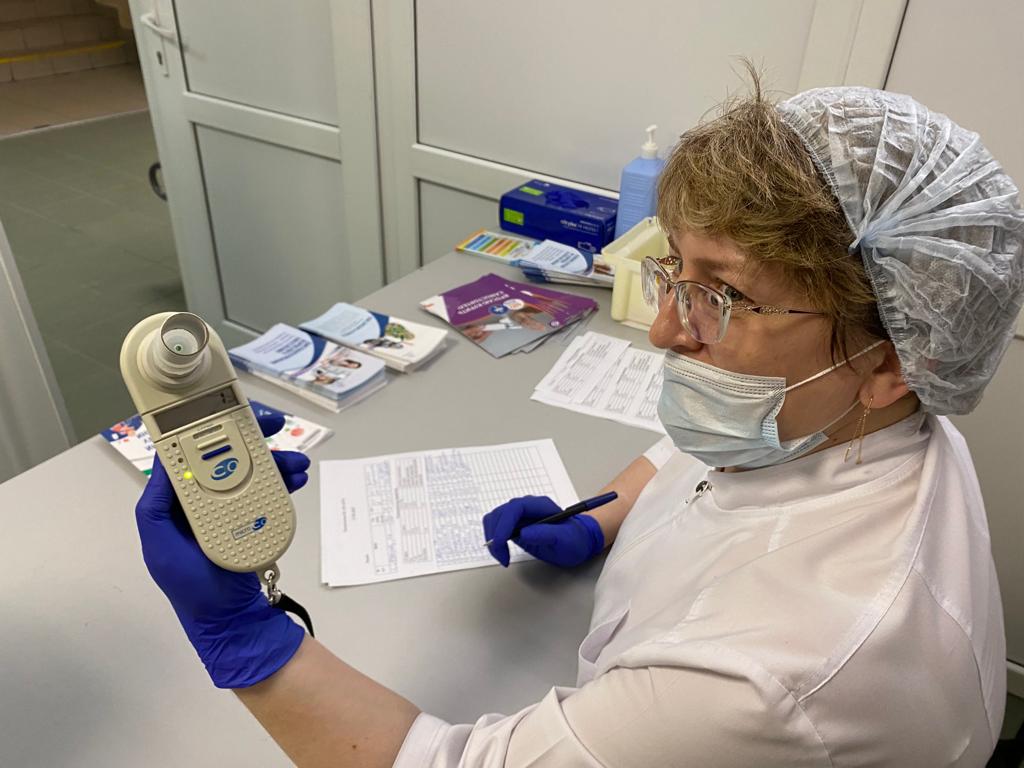 Пункт исследования лёгких на смокелайзере был организован в холле первой взрослой поликлиники. Этот экспресс-метод позволяет определить концентрации угарного газа в выдыхаемом воздухе - у курильщиков он значительно выше, чем у некурящих людей.