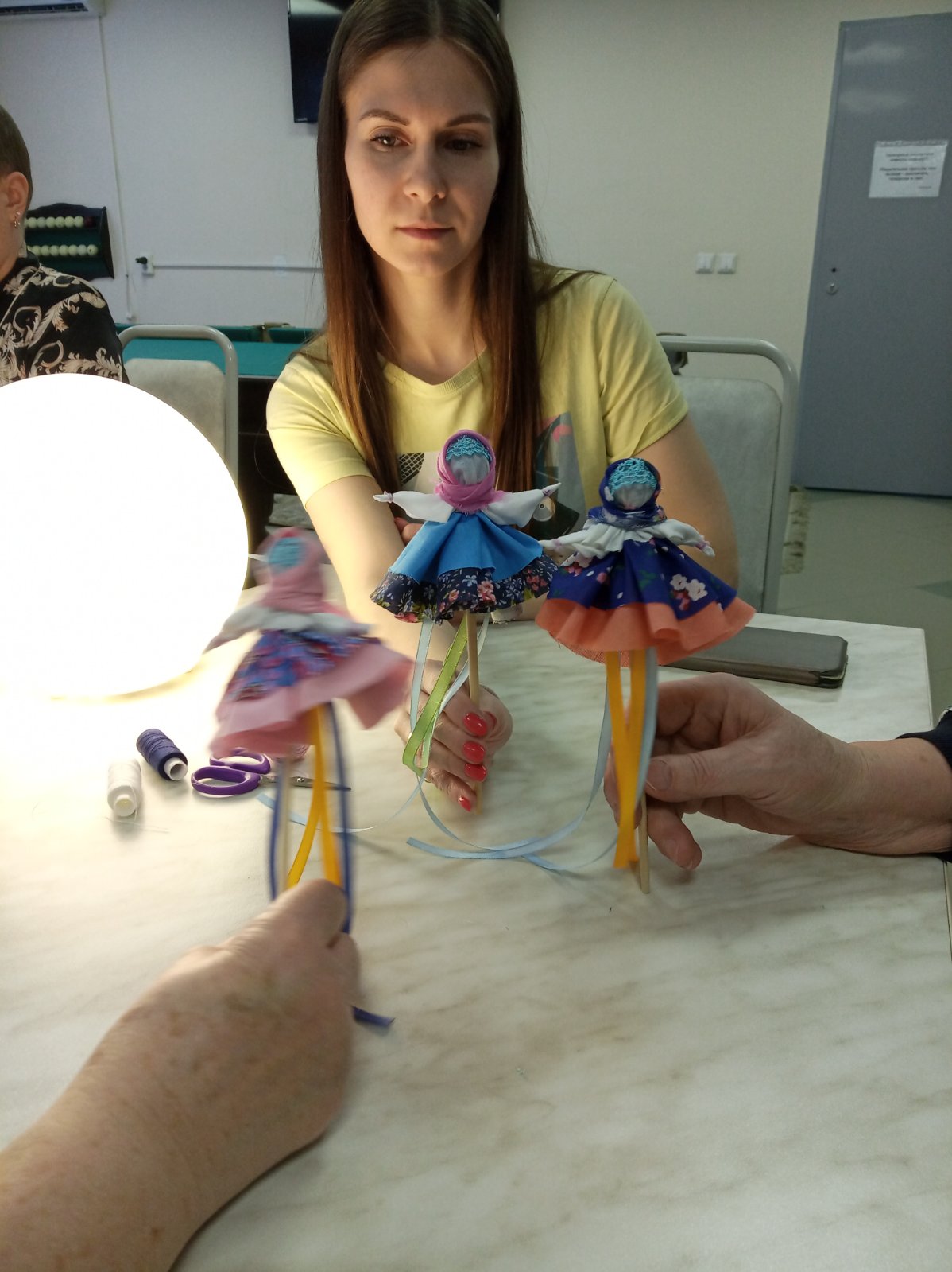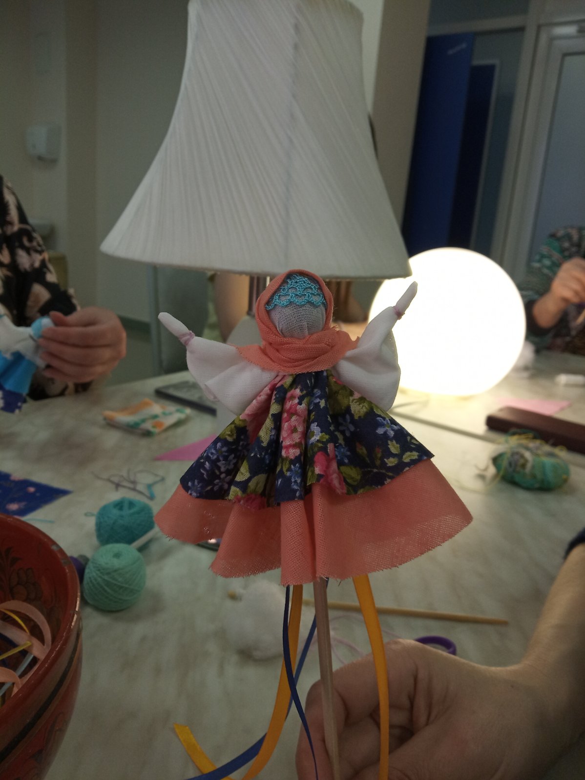 - Мы делали «хороводницу» – игровую куклу-мотанку. Хоровод – самый первый и самый популярный танец у славян. Но маленьких детей в хороводы не брали. Мамы мастерили девочкам куклы, если крутить палочку в ладонях – кукла вращается, танцует. По кукле в обе ручки – и ребенок чувствовал себя в хороводе. А ещё раньше куклу делали на веретене. Таким образом девочка осваивала веретено.