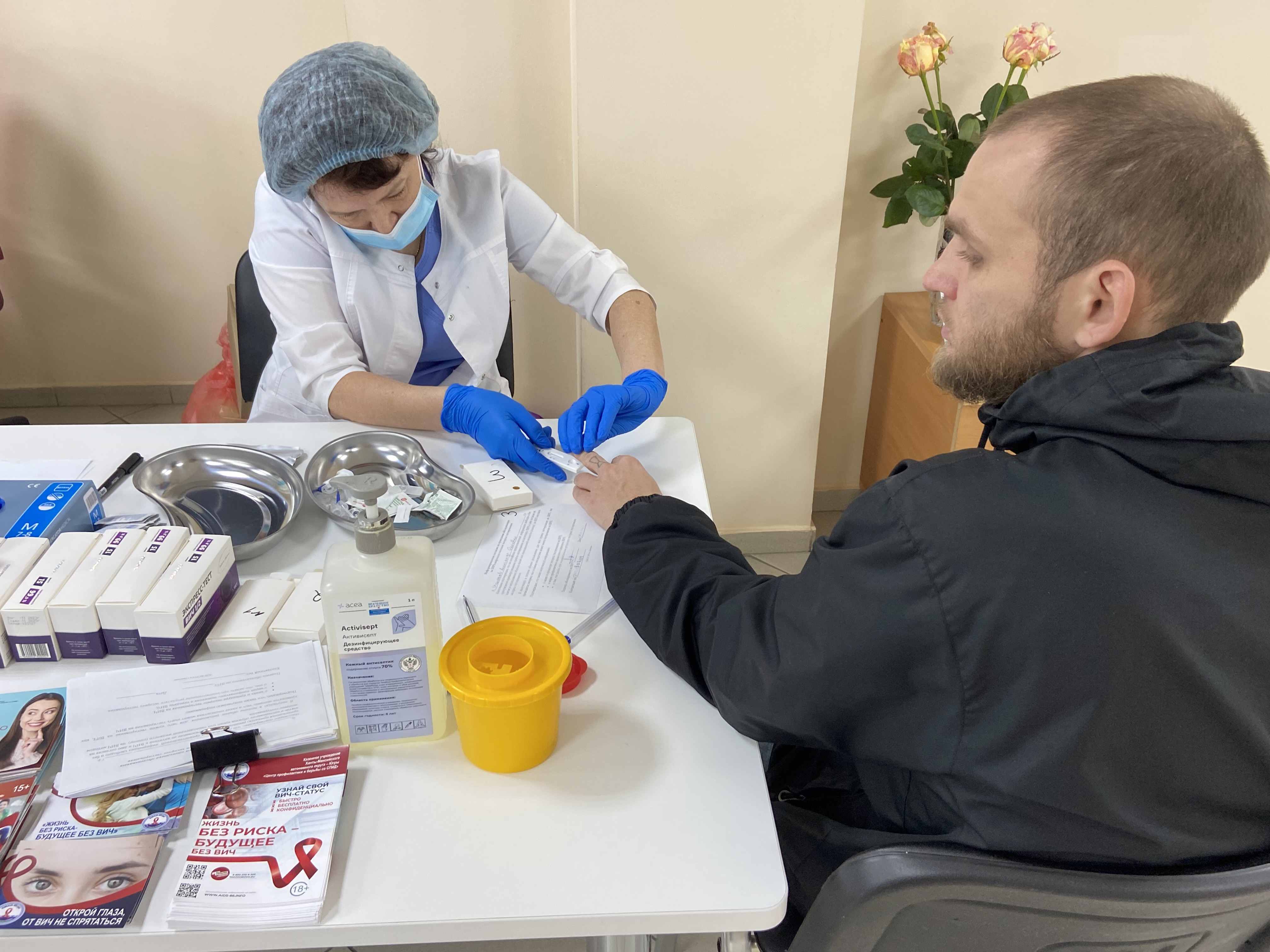 Специалисты кабинета по работе с больными ВИЧ‑инфекцией развернули мобильный пункт на первом этаже поликлиники и провели экспресс‑тесты для всех желающих.
