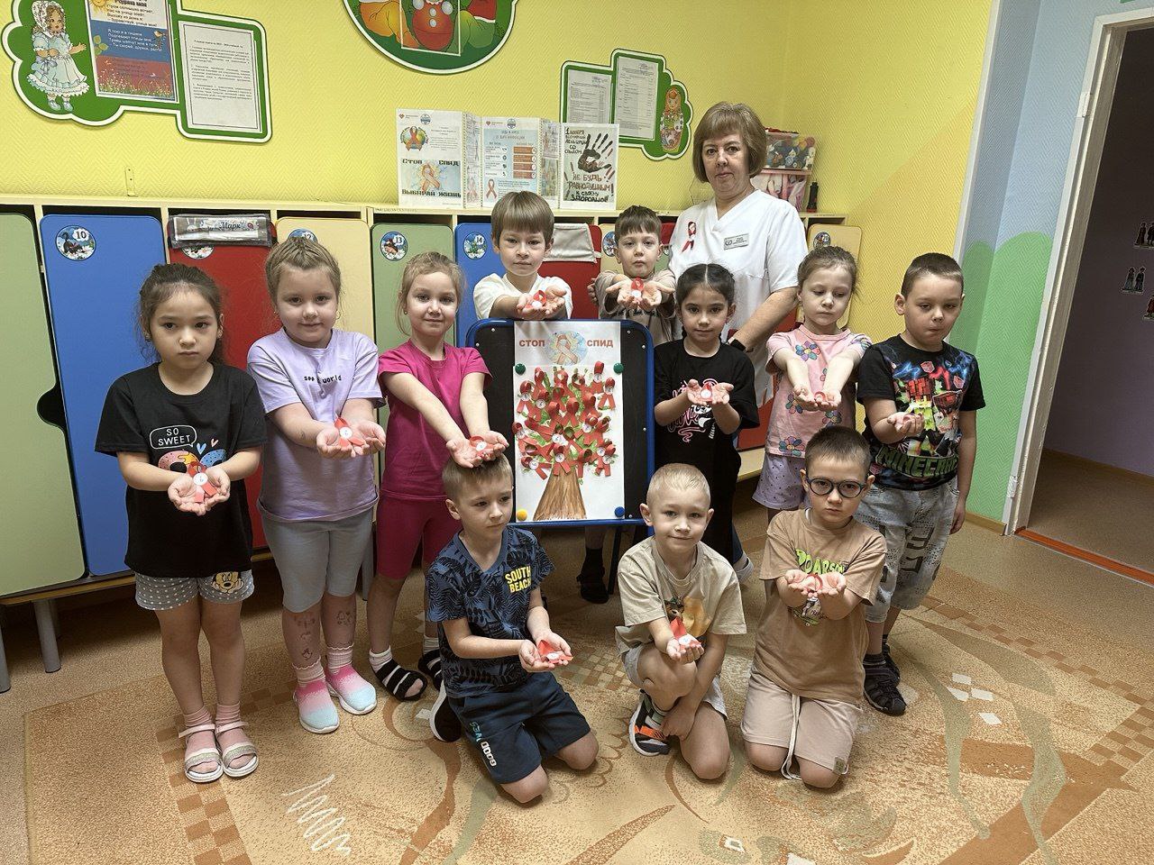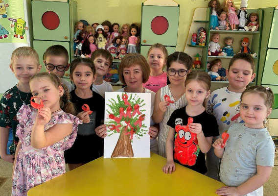 Вместе с воспитателями и медиком ребята создали «Дерево жизни», символизирующее единство, силу и поддержку. Дети также изготовили «Красные ленточки» — международный символ осведомленности о ВИЧ/СПИДе.