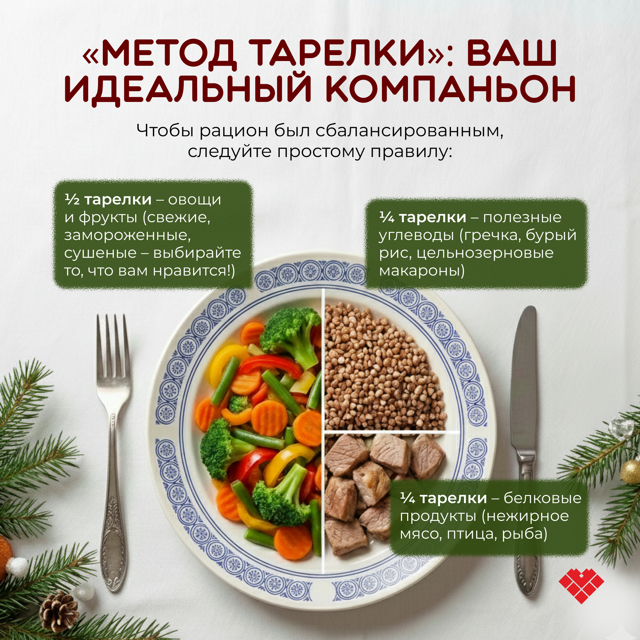 Чтобы сохранить здоровье и отличное самочувствие в праздничные дни Анна Михайловна рекомендует придерживаться «метода тарелки» даже в Новый год. Это золотое правило гласит: половина вашей тарелки должна состоять из овощей и фруктов, четверть – из «полезных углеводов», и еще четверть – из белковых продуктов (мясо, рыба).