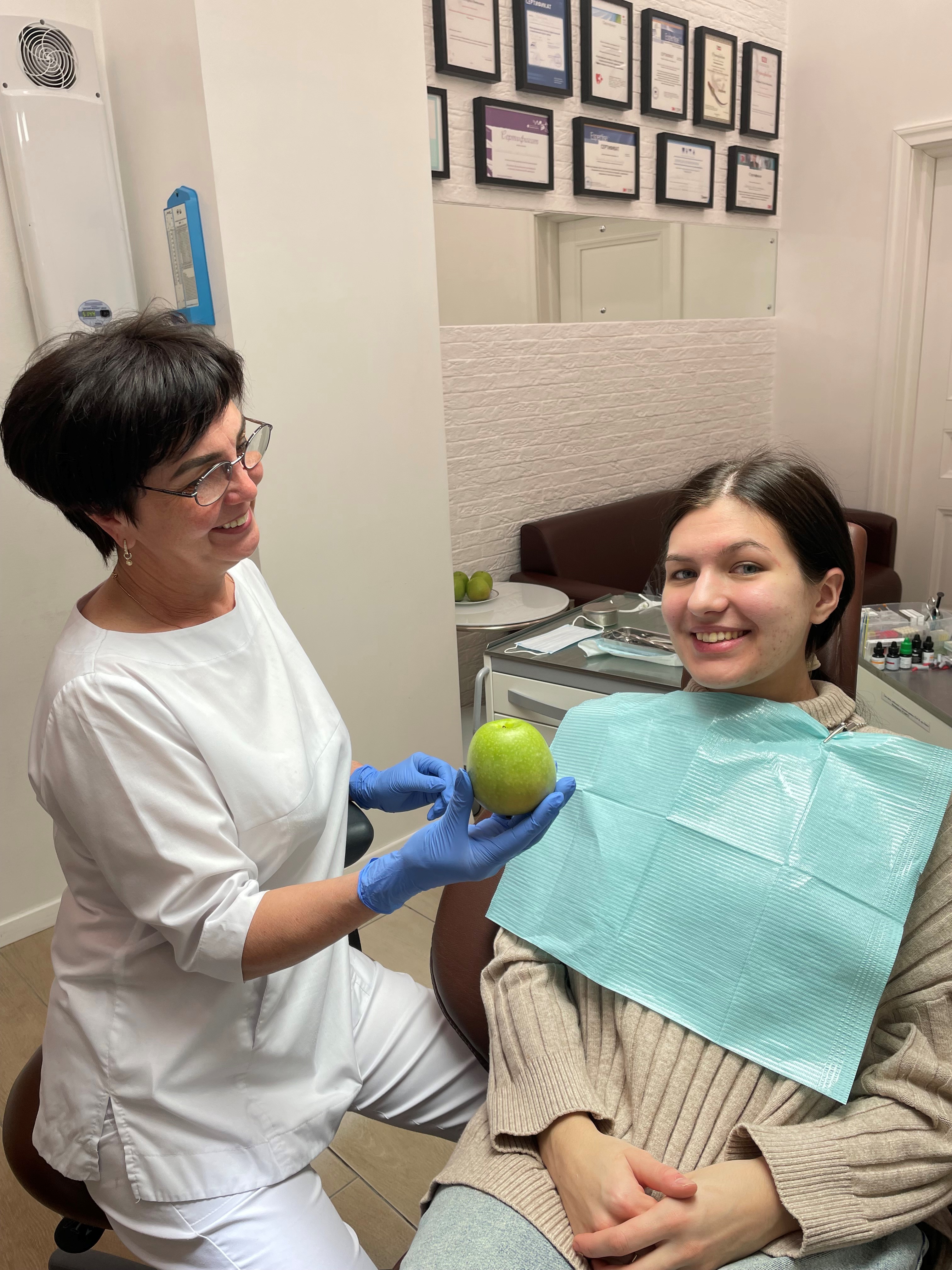 В этот день в поликлинике царила праздничная атмосфера. Коридоры и кабинеты были украшены зелеными воздушными шарами, тематическими листовками и детскими рисунками. Каждый из пациентов, пришедших на прием к специалистам, получил в подарок сочное зеленое яблоко. Крепкое наливное яблоко — это не просто подарок, а показатель отличного состояния зубов: только обладатель здоровой улыбки может легко и с удовольствием раскусить твердый плод.
